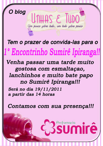 Fui convidada pela Sumirê Ipiranga para ajudar a organizar o primeiro encontrinho deles! Fiquei muito honrada e aceitei, é claro!!! Então venho aqui convida-las!!!! Para participar é fácil... Como no outro encontro que fiz as inscrições são livres para todas as leitoras do blog!! Sem muitas obrigações, só vontade de participar, disposição e muita simpatia!!!